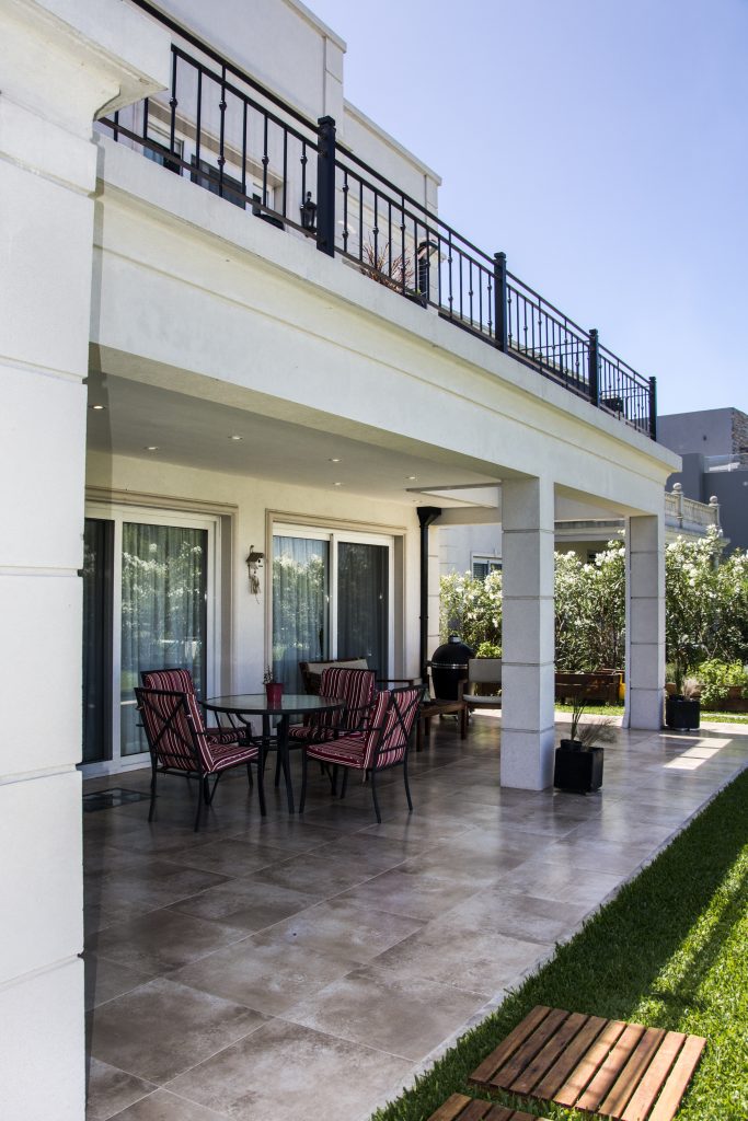 Me llamaron para llevar a cabo la construcción de esta propiedad cuando estaba en un 30% de avance de obra por parte de otra empresa, que había decidido no continuarla. La casa es de estilo francés, con escaleras y accesos que fuimos diseñando sobre la marcha, y fueron materializados en mármol de un color rojo dominante, barandas diseñadas cuidadosamente y construidas en hierro y acero inoxidable, y toda la planta baja, que abarca los usos comunes de la propiedad, tiene sus paredes revestidas por una boiserie de madera pintada de blanco que le brinda a la ambientación interior una calidez y diseño irrepetible.